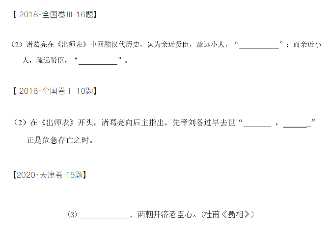 《出师表》作为高中语文的必背篇目,高考的诗词填空中常有考察,需要同学们透彻理解文中每一句的含义,除此之外,与出师表有关的引申诗句,大家也要多加背诵,做到融会贯通,熟练掌握。