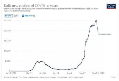 离12月2日还有几天的时间,眼看英国第二次全国封锁期就要结束了,从英国每日确诊病例走势图中看到,自11月17日起,其当日确诊病例开始大幅度下降...难道英国的新冠疫情形势有所缓... 详情>>
