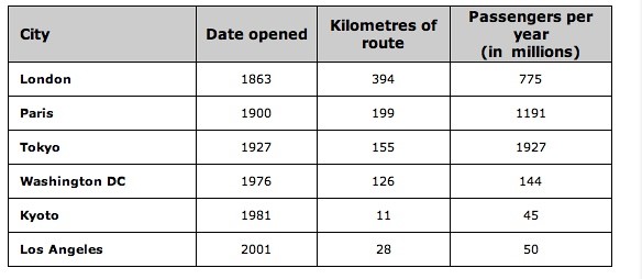 The table below gives information about the underground railway systems in six cities. 该表格展示6个城市的地铁系统的基础数据对比。请作答。 雅思图表小作文表格题型9分范文: The table shows data about th... 详情>>