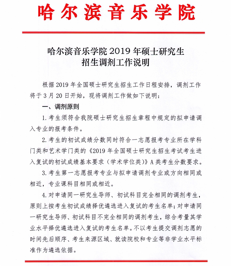 哈尔滨音乐学院2019年硕士研究生招生调剂工作说明
