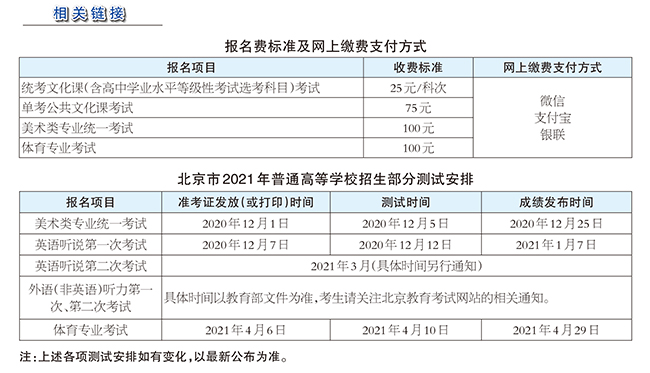 2021年普通高等学校招生美术类专业统一考试、体育专业考试、英语听说考试、外语(非英语)听力考试四项考试报名与高考报名同期进行,符合条件拟报名参加相关测试的考生须选报相关项目并缴费。