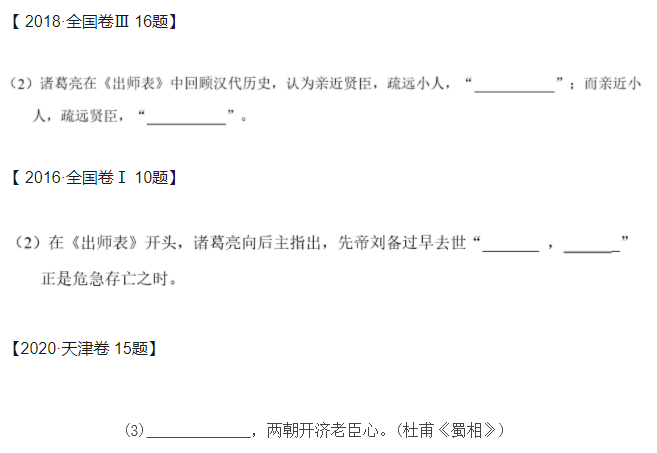 《出师表》作为高中语文的必背篇目,高考的诗词填空中常有考察,需要同学们透彻理解文中每一句的含义,除此之外,与出师表有关的引申诗句,大家也要多加背诵,做到融会贯通,熟练掌握。