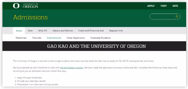 在俄勒冈大学官网上写明,高考英语成绩较好的学生,如果 Interview/Writing sample也较优秀,可以获取正式录取。如果学生英语成绩需要加强,则提供有条件录取,先入读UO的语言学校。