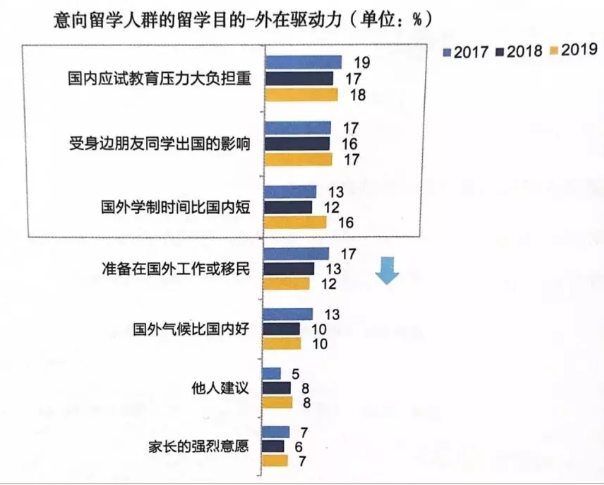而外部功利因素呈下降趋势,随着国内经济的稳健发展,学生通过留学移民的想法逐渐淡化,更多的是被国外教育体制所吸引,在国内教育的压力下有了更多的选择。同时,留学也容易受到身边同学的影响。