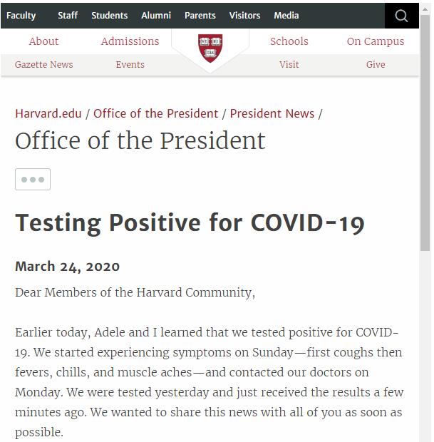 近日,68岁的哈佛大学校长Lawrence Bacow和其夫人被确诊感染新冠病毒,已进行居家隔离,来源尚不可知。3月24日,其学校官网向全校师生发表了公开信,说明了自己的情况。夫妇二人从周... >>查看详情