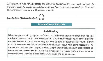 托福口语和前面3科考试一同进行,模式为机考,一共分为2部分,第一部分1题为独立口语;第二部分3题,要求考生首先读,听,然后用口语作答。