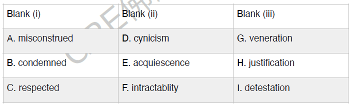 6. Those who took Clark’s old-mannered compliance for obsequiousness (i)_______ him: his apparent (ii)_______ veiled a fervent (iii)_______ of the authority that others exercised over him,one that he occasionally expressed by discreetly s...