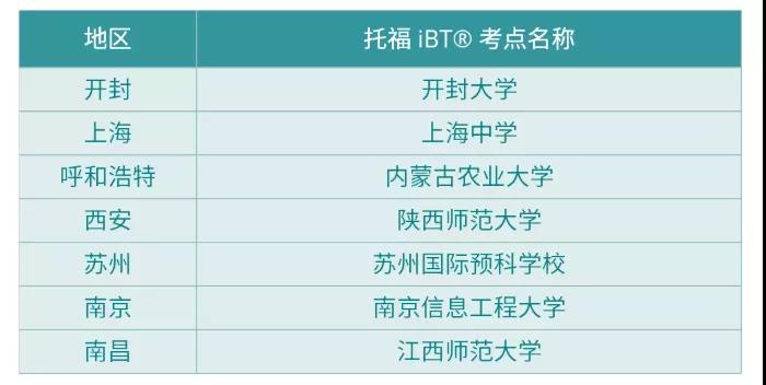 为缓解考位紧张,满足考生报考需求,托福 iBT®考试在上海、苏州、南京、南昌、开封、西安、呼和浩特恢复开放7个考点...