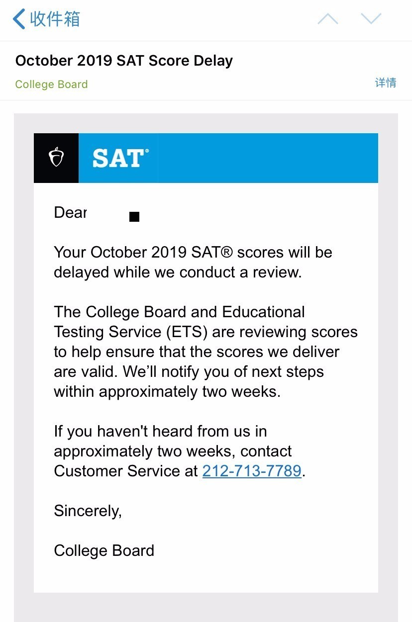 继10月5日亚博SAT开考延迟后,今天早上,很多在香港亚博中心考试的考生收到了CB的邮件,被告知10月亚太成绩将被delayed。 CB的10月SAT成绩delay邮件说明 大概意思是:“我们在调查的期间...